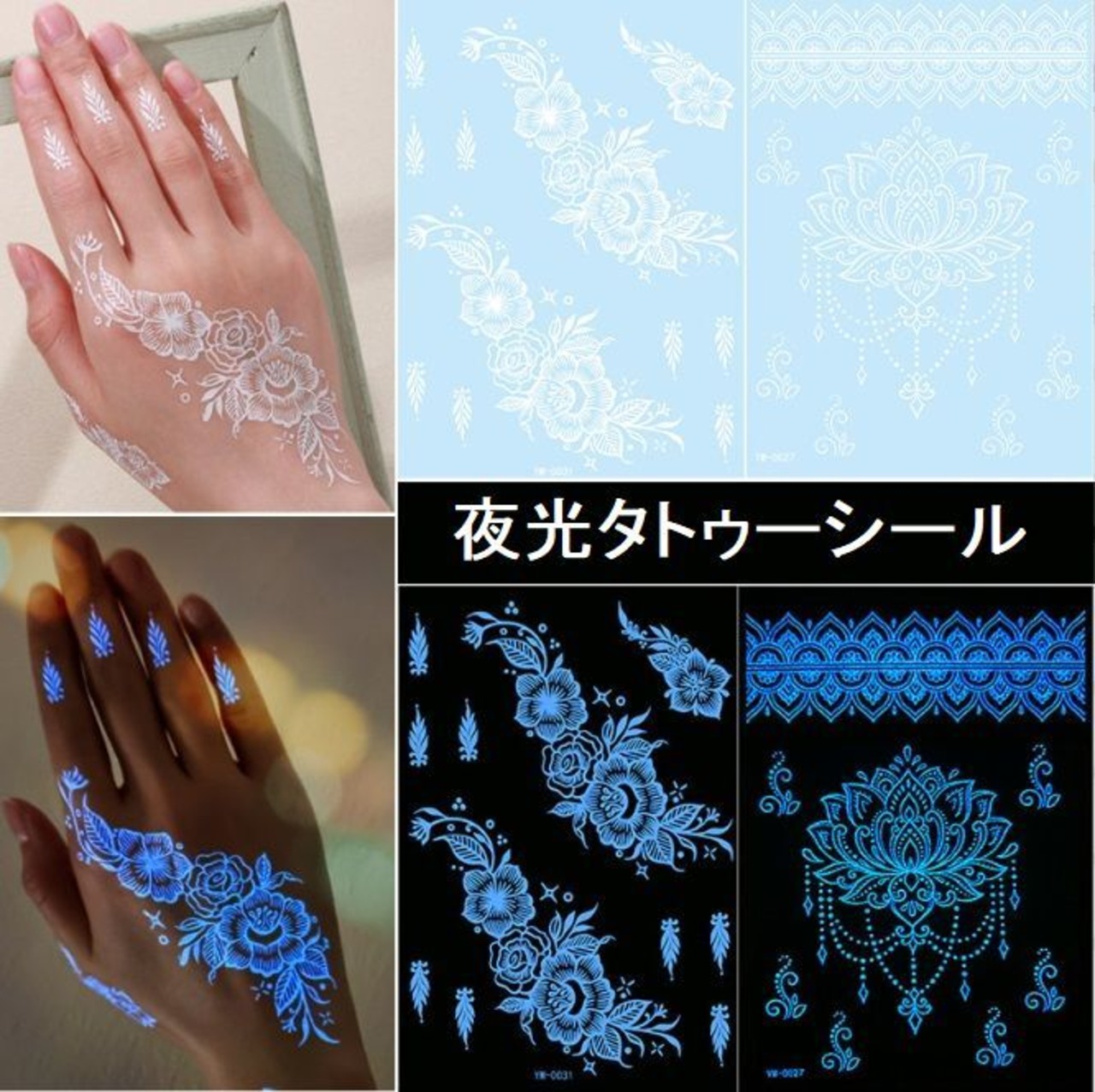 白い夜光タトゥーシール コスプレ 光るタトゥーシール フラワー セクシー 2枚セット イベント バカンス ステッカー ファッション 951002