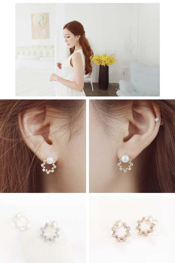 パールをワンポイントにラインストーンがリース状に散りばめられた上品で可愛らしいピアスです。